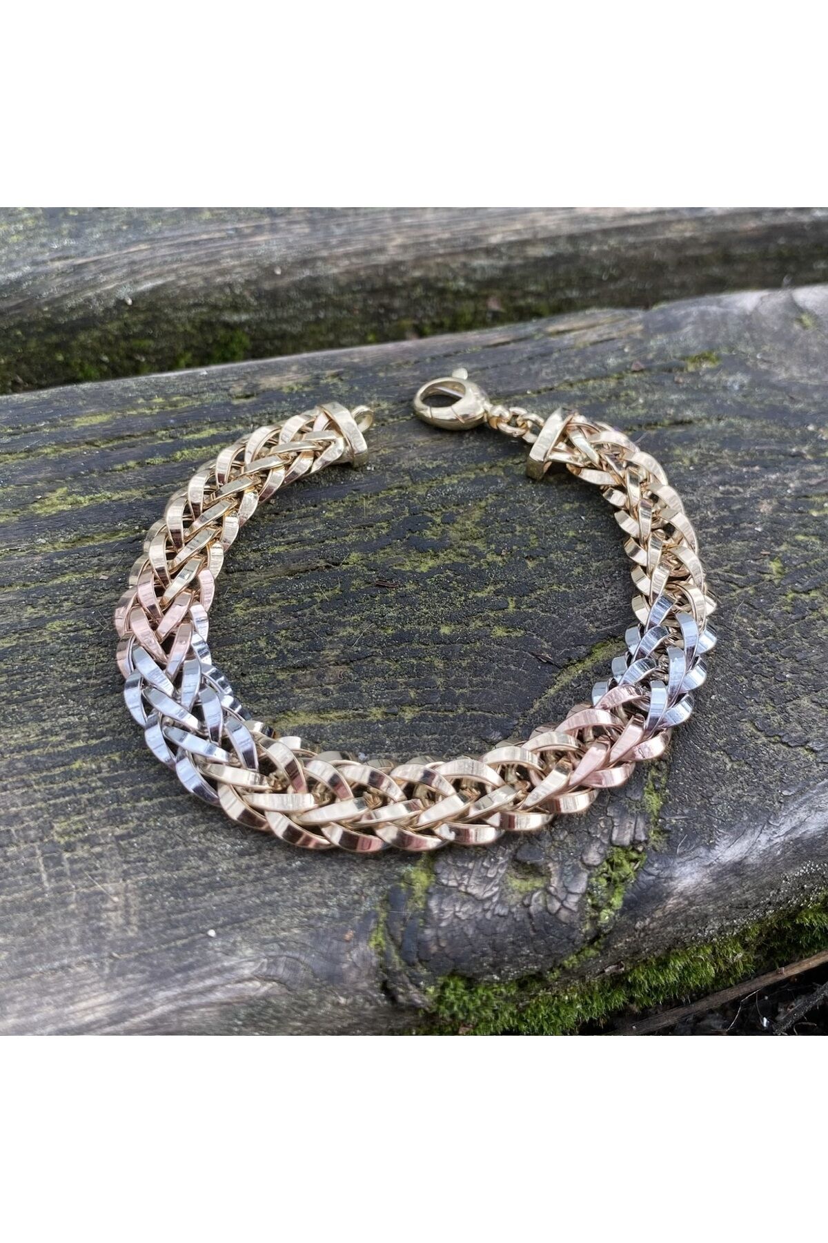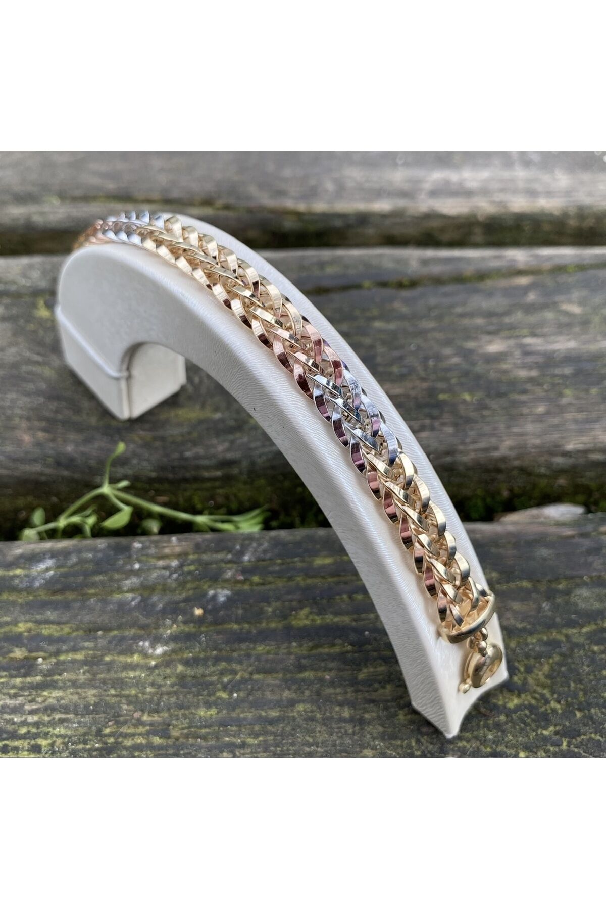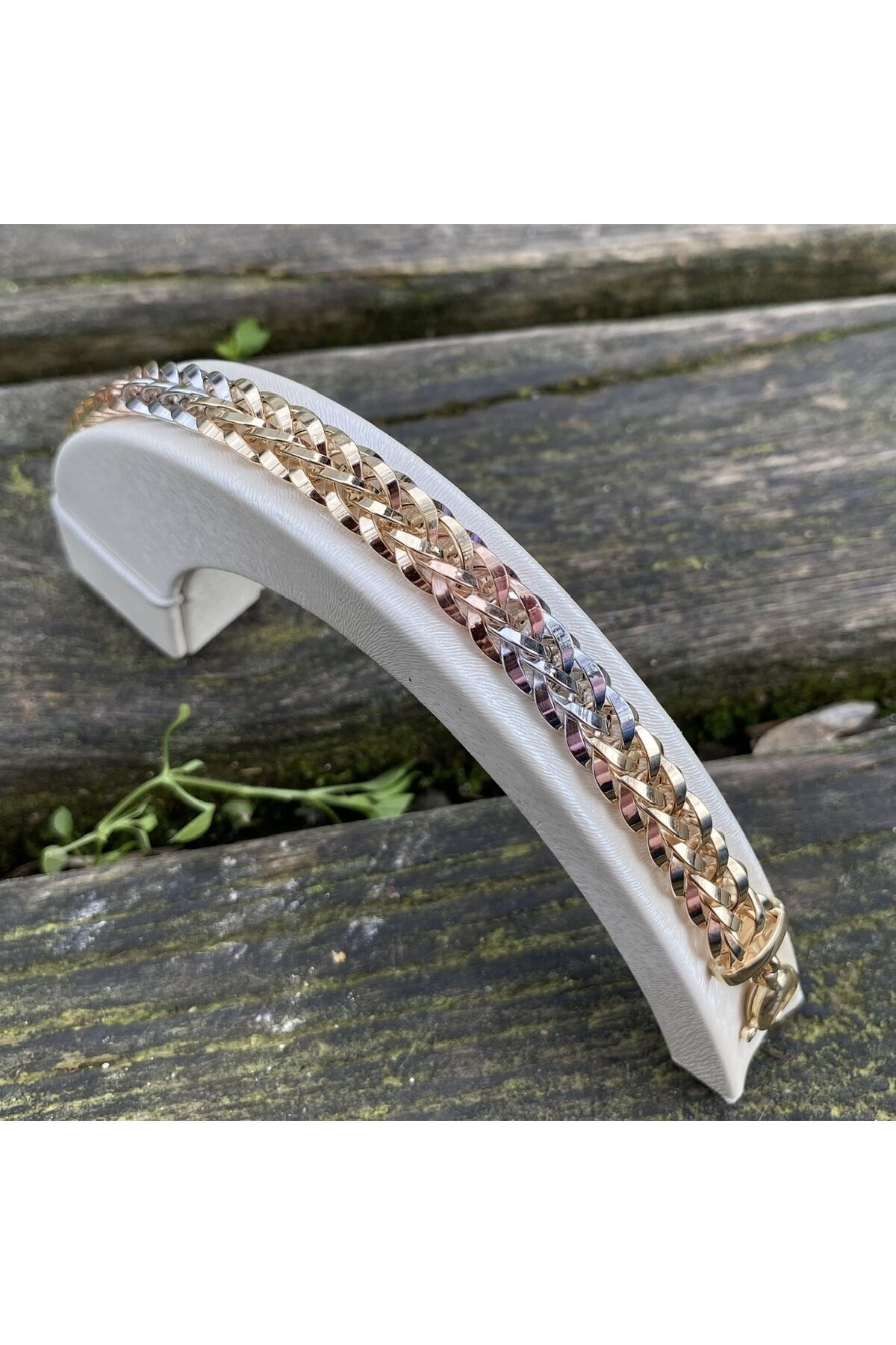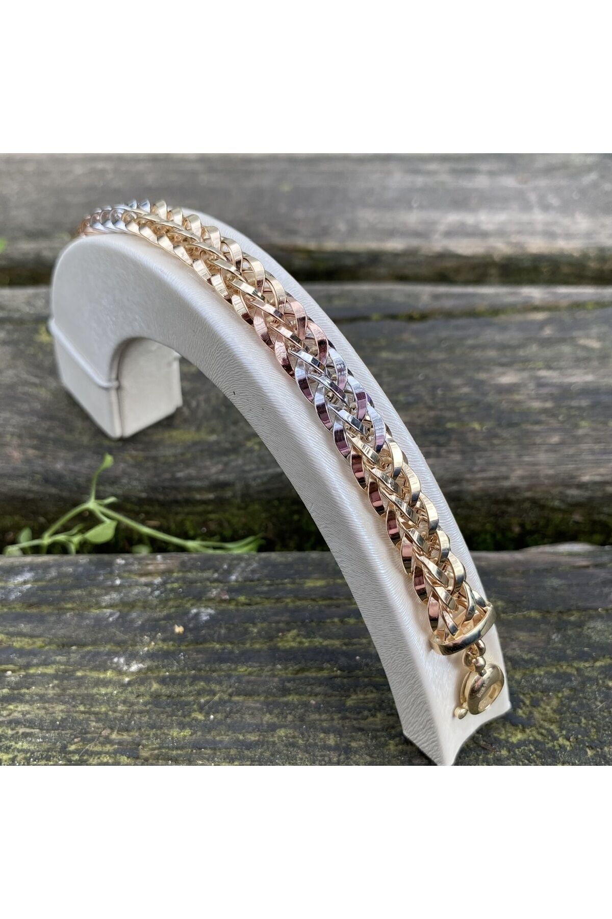 - Zarif tasarımıyla dikkat çeken altın üç renkli bileklik, her kıyafetle uyum sağlayarak şıklığınızı tamamlar.; - 14 ayar altın kullanımı sayesinde hem kaliteyi hem de dayanıklılığı bir arada sunar; uzun süreli kullanım için idealdir.; - Altın materyali ile hem günlük kullanımda hem de özel günlerde tercih edebileceğiniz bu bileklik, değerli anlarınızda yanınızda olur.; - Kadın ve kız çocuklarına hitap eden bu bileklik, cinsiyet ayrımı gözetmeden herkes için uygun bir aksesuardır.; Ürün uzunluk 19 cm Ürün en 10mm